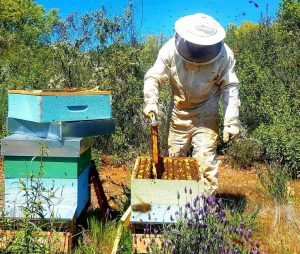O nosso trabalho em campo não para. A partir de fevereiro começamos a avaliar como foi o inverno das colmeias, alinhamos e realinhamos os quadros, que é o lugar onde vivem e nascem as abelhas, avaliamos doenças, limpamos terrenos, aplicamos caça pólen, desdobramos colmeias quando estão cheias de população e assim aumentamos o nosso número de colmeias e evitamos que as abelhas fujam, literalmente das nossas colmeias. É que as abelhas não gostam de estar apertadas!!! Colocamos meias alças, de onde sairá o mel, e quase todos os dias avaliamos a situação de cada colmeia.